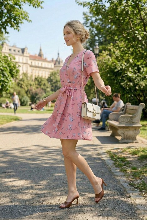 Платье молодежное из тканого штапельного полотна с набивным цветочным рисунком, отрезное по талии, с расклешенной юбкой, собранной по талии с помощью эластичной тесьмы и короткими втачными рукавами. Полочки лифа образуют запах и V-образную конфигурацию выреза горловины. Бортовые срезы и горловина окантованы основным материалом.