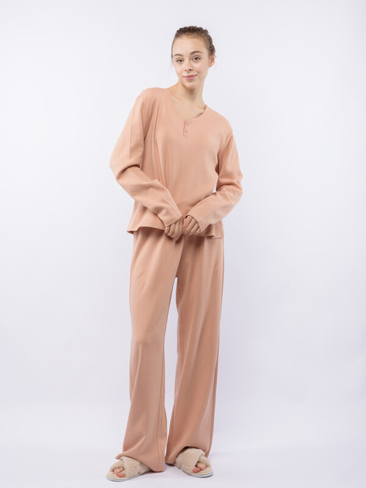 Домашний костюм OVERSIZE из эластичного вафельного трикотажа розово-бежевого цвета  состоит из лонгслива и широких брюк. Лонгслив с V-образным вырезом с 2 пуговицами, отделка горловины из материала изделия. Рукав длинный без манжет, подгиб и плоский шов по запястью и низу изделия. Брюки на широкой резинке со шнурком. Подгиб и плоский шов по низу брюк. XS-XS(170-84-90), S-S(170-88-94), M-M(170-92-98), L-L(170-96-102), XL-XL(170-100-106)