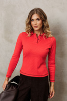 Джемпер в стиле прямой футболки, воротником-стойкой и короткими рукавами. Прямой силуэт, стандартная длина. Средняя плотность вязания, пластичная фактура. Выполнен гладью из мягкой полушерстяной пряжи. Шерсть в составе сохраняет тепло, а благодаря волокнам акрила изделие мягкое и дольше сохраняет форму.