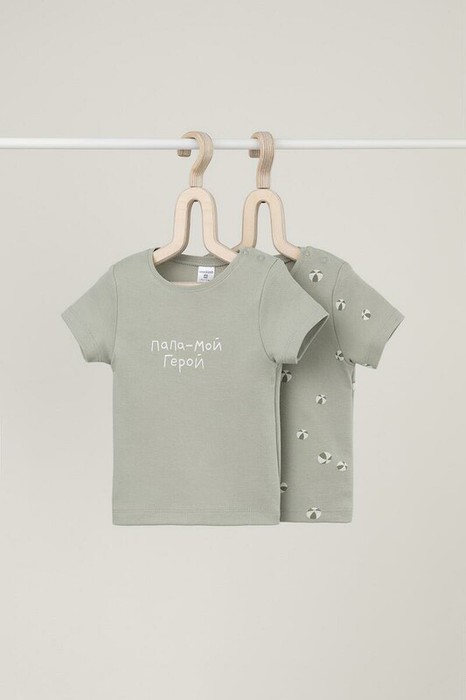 Футболки для мальчика в упаковке 2 шт из высококачественного трикотажного полотна. Оригинальная набивка выполнена из стойких гипоаллергенных текстильных красителей. Для удобства на плече застежка на кнопки.