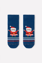 Новогодние трикотажные носки обычной длины с формованной пяткой. Украшены рисунком с Дедом Морозом. Эластичная резинка по верхнему краю.