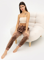 Свободные женские брюки со стрелками и боковыми карманами из плотного гладкого трикотажа интерлок. Модель с контрастными боковыми вставками и разрезами по низу. Застегиваются на молнию и кнопку. Низ обработан плоскими швами .