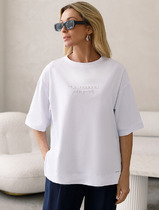 Футболка выполнена из премиального хлопка. Лаконичный принт нанесен россыпью сияющих страз, надежно закрепленных на изделии. Наличие эластана в составе гарантирует комфорт и формоустойчивость. Изделие дополнено фирменным металлическим логотипом бренда.