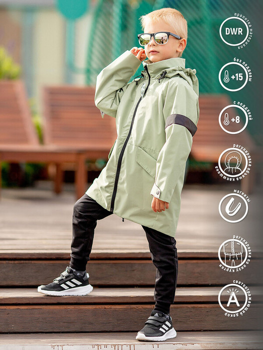 Куртка-парка для мальчика в стиле кэжуал Дрим удлиненная в светло-зеленой расцветке. В этой ветровке ребенку будет комфортно теплой весной и осенью.Ткань защищает от ветра и дождя, сохраняя ощущение сухости и тепла. Центральная застежка на молнию, есть капюшон. Подклад комбинированный из флиса и таффеты.   Особенности:  Регулируемый капюшон с кнопкой, который можно спрятать в воротникСтиль кэжуалКарманы на магнитахРегулируемый по низу рукав и низОтложная светоотражающая планка на рукавеСветоотражающие элементы и термотрансферы Характеристики:Ткань верха: Курточная ткань (мембрана) Подклад: полар флис / таффетаУтеплитель: без утеплителя Температурный режим от +8 (с поддевой) до +15 С (без поддевы)Производитель: batik