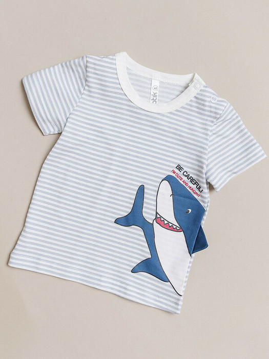 Футболка для мальчика c коротким рукавом в полоску с принтом в виде акулы. Стильная футболка из супрема пенье для летнего отдыха и повседневной носки. Круглая горловина на кнопках. Футболка подойдет для малышей от 3 месяцев до 2 лет.Характеристики:Ткань: Супрем пенье 100% хлопокПроизводитель: batik