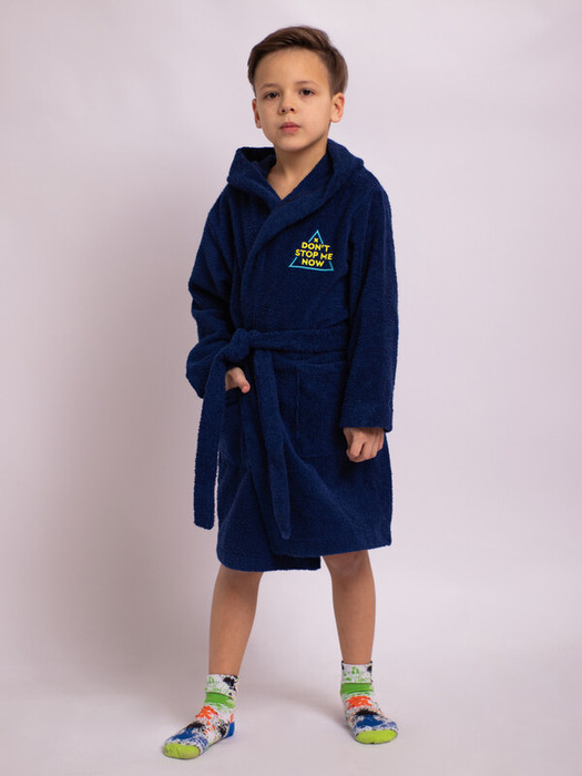 Халат синий детский с капюшоном из двусторонней махры. Стильный, яркий, красивый халат с нашивкой на груди. Модель домашнего халата с поясом на талии и двумя удобными накладными карманами. Халат махровый для мальчика от Batik. Мягкий и пушистый банный халат из 100% хлопка является экологичным и гипоаллергенным.