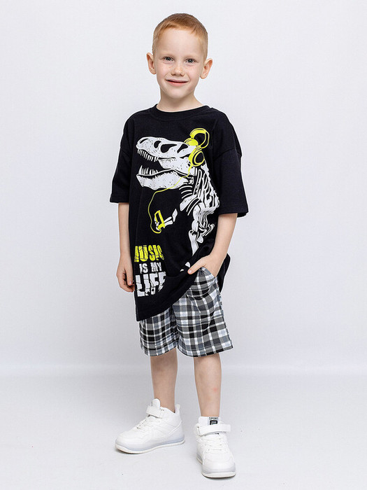 Комплект для мальчика трикотажный: футболка с коротким рукавом + шорты. Футболка черная кроя оверсайз с принтом в виде динозавра и надписей. Шорты с карманами в клетку. Универсальный комплект для дома и улицы.Характеристики:Ткань: Супрем пенье 100% хлопокПроизводитель: batik