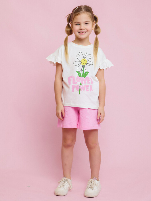 Комплект трикотажный для девочки: футболка с коротким рукавом и шорты. Комплект одежды из трикотажного полотна высокого качества — супрем с эластаном. Рукава футболки с оборками, спереди принт в виде цветка с надписью. Шорты розовые свободного кроя.Характеристики:Ткань: Супрем 92% хлопок 8% эластанПроизводитель: batik