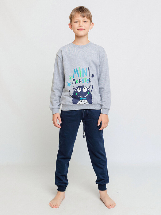 Пижама для мальчика трикотажная из футера с начесом: футболка с длинным рукавом и брюки. Детская пижама сшита из 100% натурального гипоаллергенного хлопка. Пижама подойдет для сна дома и в детском саду, а также можно носить как домашний костюм. Серо-синяя расцветка и принт в виде монстрика на футболке. Брюки с карманами на резинке и завязках.Характеристики:Материал: Футер 2х нитка с начесом пенье 100% хлопокПроизводитель: batik