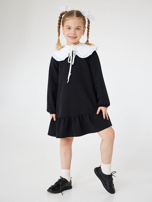 Платье для школы с оборкой по низу. Длинный рукав на манжете. Застежка на пуговку на спинке, съемный белый воротник на завязках. Характеристики:Ткань:Плательная ткань 95%полиэстер, 5%спандексПроизводитель: Batik