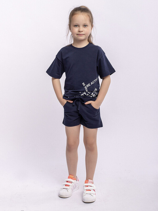 Шорты для девочки синие спортивные из футера. Шнурок в поясе, карманы по бокам.