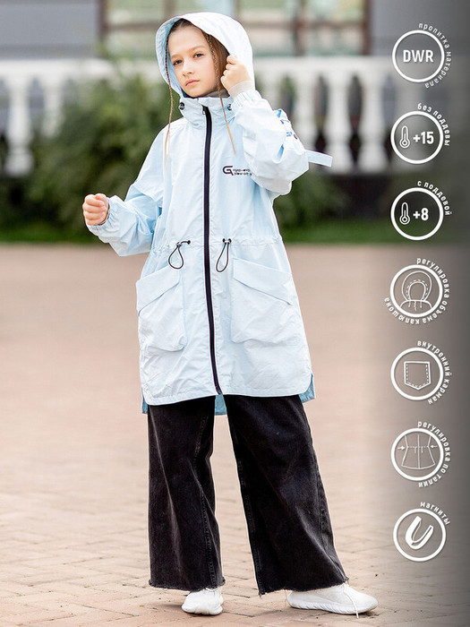 Ветровка-пыльник для девочки Джун из коллекции Весна-2023 с капюшоном нежно-голубая представляет собой демисезонную удлиненную парку из курточной ткани с водоотталкивающей пропиткой. Застегивается на центральную молнию с защитой подбородка на воротнике. На груди небольшая надпись. Слегка удлиненная спинка, разрезы по бокам.   Особенности:  Регулируемый капюшон трансформируется в воротник На рукаве хлястики-утяжки на кнопках  Эластичный низ рукава Регулировка по талии Накладные карманы с клапаном на магните Светоотражающие термотрансферы Характеристики:Ткань верха: Курточная ткань с водоотталкивающей пропиткой Подклад: полиэстер/сеткаУтеплитель: нет Температурный режим: + 8 С (с поддевой), +15 С (без поддевы)Производитель: batik