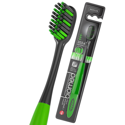 Зубная щетка средней жесткости Biomed BLACK с угольным напылением быстро удаляет зубной налет и деликатно отбеливает эмаль. Клинически доказанный эффект очищения за 30 секунд!