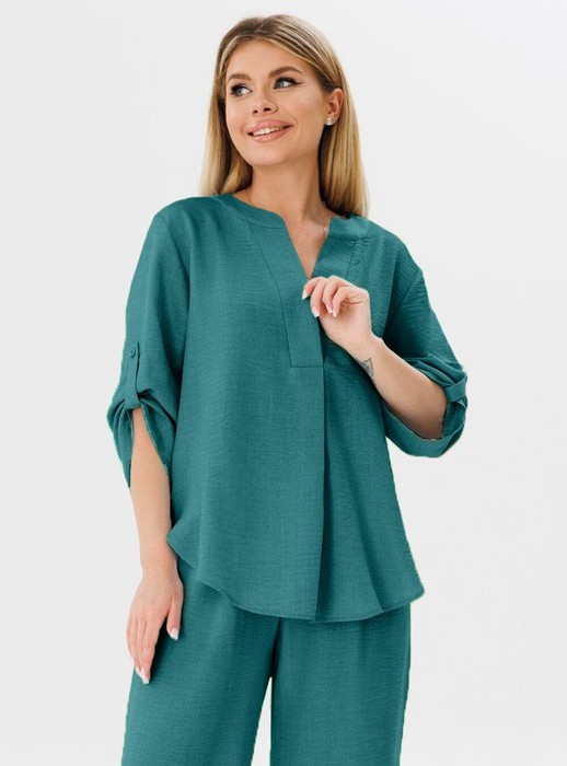 Блузка женская прямого силуэта с притачным рукавом. По переду V-образный вырез с притачной планкой и складкой. Рукав на пате. Низ фигурный.