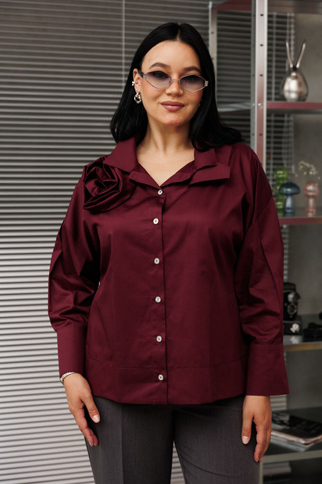 Блузка женская с акцентным декором полуприлегающего силуэта. Рукав "летучая мышь" с подрезом по линии проймы и односторонними складками и манжетой. Застежка- планка на петли и пуговицы. Воротник стояче-отложной. В качестве декора - дополнительный воротник, плавно переходящий в цветок. Благодаря своему крою станет базовой вещью в вашем гардеробе. Легко сочетается с любыми брюками, юбками, платьями и джинсами. Позволит создать большое количество образов для офиса, прогулок, праздничных мероприятий. Длина блузки (50-54)- 58см, (56-60)-61 см . Длина рукава от горловины с манжетой (50-54)-68см, (56-60)-70см.