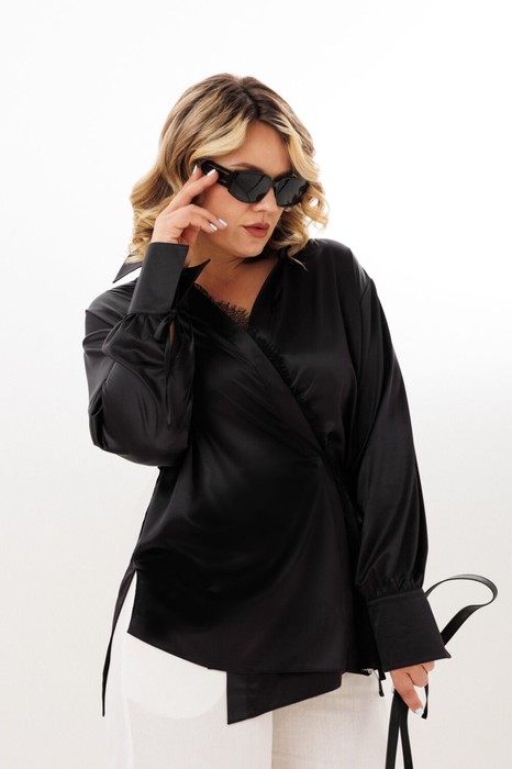 Оригинальная блузка женская из атласной ткани прямого силуэта со спущенным плечом. По бокам разрезы. Рукав со сборкой на манжете и завязками. По полочке идет отрезная планка с отделкой кружевом и застежка в виде запаха с завязками. Воротник на отрезной стойке. Спинка длинее полочки. Такой женский офисный стиль можно носить, сочетая с другими вещами гардероба, создавая новые образы. Ткань атласная качественная и очень комфортная. Этот универсальная стильная блузка есть в больших размерах. Она отлично подойдет для офиса, для праздника, на каждый день, для вечеринки и корпоративы, для прогулок, для отдыха, для работы, на выпускной, на день рождения для высоких и для невысоких девушек и женщин. Блузка станет любимой вещью в гардеробе и сделает Ваш образ незабываемым! В «Анастасия» Вы всегда найдете богатый выбор качественной одежды для женщин больших размеров. Длина по спинке: (50-54)-76 см, (56-60)-79см. Длина рукава с манжетой: (50-54)-57 см, (56-60)-59см