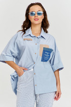 Блузка в горох с объемными рукавами на манжетах прекрасно впишется в любой гардероб. Изделие с планкой на пуговицах прекрасно сидит на фигуре, прямой крой вещи вытягивает силуэт, скрывает несовершенства и подчёркивает достоинства. Модель из крепа подойдет для носки в теплую погоду, зимой под жакет, жилет, кардиган, прекрасно сочетается не только с классическими брюками и юбками. Дизайнерская брошь ручной работы дополняет и украшает блузку.