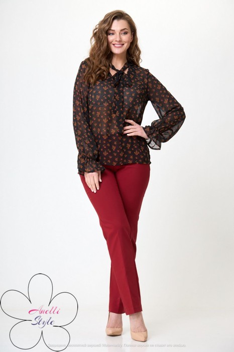 Блуза женская прямого кроя, длиной до середины бедра. Рукав длинный, низ на резинке. По переду V-образный вырез, с бантом. Блузка отличный вариант вне сезона, отлично будет сидеть на любой фигуре.    Вся необходимая информация о производителе указана на этикетке. При сьемке в образе использованы брюки бренда ANELLIstyle М - 895