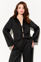 Ее свободный крой и мягкие спущенные плечи создают основу для невесомого силуэта. Глубокий V-образный вырез придает образу изысканность, а изящная кокетка добавляет художественный штрих. Рукав-кимано, собранный на резинке, мягко облегает запястье, предлагая вам варьировать его длину.