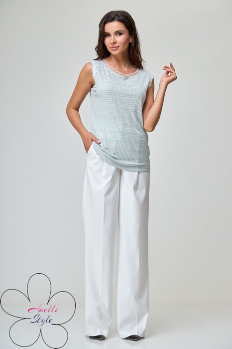 При съемке в образе использованы изделия бренда ANELLIstyle – брюки 1296 белые.
