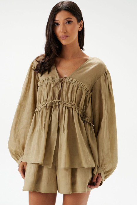 Блузка свободного кроя, выполнена из легкого натурального полотна нежно-розового цвета. Прямой свободный крой, рукав широкий вточной, низ присборен на фигурную узкую манжету, V-образный вырез, лиф отрезной по линии талии, застежка центральная на шнурки-завязки. Длина по спинке 64 см, длина рукава от края горловины 68 см.