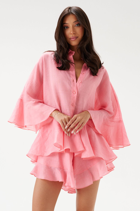 Блузка свободного кроя, выполнена из лёгкого натурального полотна розового цвета ; рами. Воротник рубашечного типа, застежка центральная на петли пуговички, крой рукава летучая мышь. Низ изделия и рукава декорированы воланом из основной ткани изделия. Длина по спинке с учетом волана - 73 см. Длина рукава от горловины - 60 см.