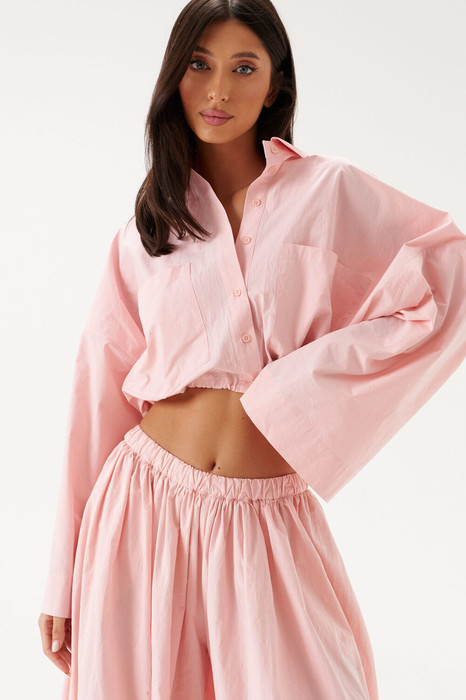 Блузка укороченная, выполнена из хлопкового полотна нежно-розового цвета. Характеристики: воротник рубашечного типа, застежка на пуговицы, по переду функциональные накладные карманы, низ присборен на резинку. Длина по спинке 43 см.