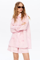 Блузка свободного кроя выполнена из полупрозрачной ткани с вышивкой голубого цвета. Характеристики: вырез V-образный, отрез по линии груди с двумя воланами, кокетка со сборкой, рукав вточной широкий, манжет на на резинке, застёжка на воздушные петли. Длина по центру спинк 59 см, длина рукава от края горловины 76 см.