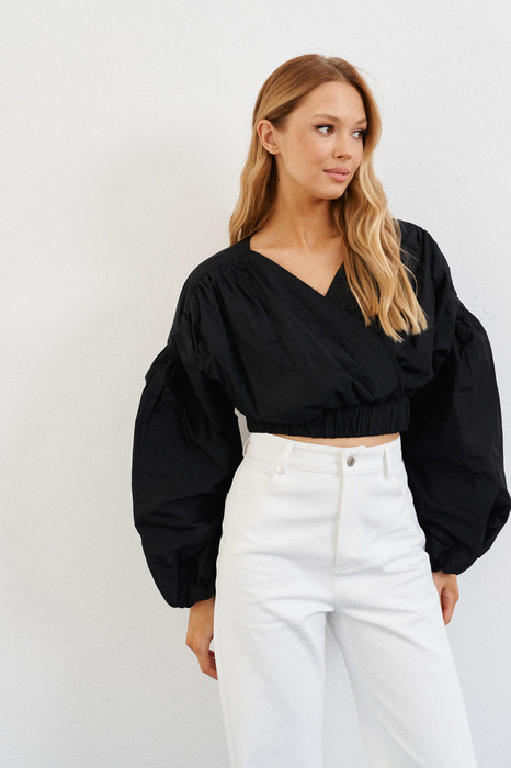 Укороченная блуза с изящными складкам выполнена из черного полотна. Блуза позволит Вам создать романтический и женственный образ.Характеристики: укороченная, подкладка, V образный вырез горловины, изящные складки от плеча до низа изделия, рукав объёмный спущен, по низу рукава подгиб на резинке. По низу изделия резинка со сборкой. Длина по спинке 47 см от плеча, длина рукава 68 см от края горловины.