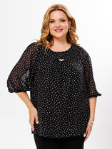 Блузка женская свободного силуэта из хлопковой ткани. Вырез горловины оформлен воротником рубашечного типа. Рукава - втачные с манжетами. На передних половинках - кокетки. Застежка выполнена в виде запаха с драпировками в области талии. Декорировано пришивной аппликацией.