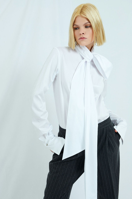 Блузка женская прямого силуэта. Воротник стойка. Застежка потайная на петли и пуговицы. Рукава длинные с притачной манжетой на 3 петли и пуговицы. В комплекте съемный бант, пристегивающийся на пуговицу.