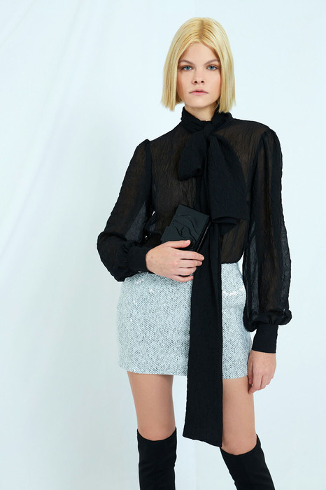 Блузка женская прямого силуэта. Воротник стойка. Застежка потайная на петли и пуговицы. В нижней части боковых швов разрезы. Рукава длинные с притачной манжетой на 2 петли и пуговицы В комплекте съемный бант, пристегивающийся на пуговицу к стойке.