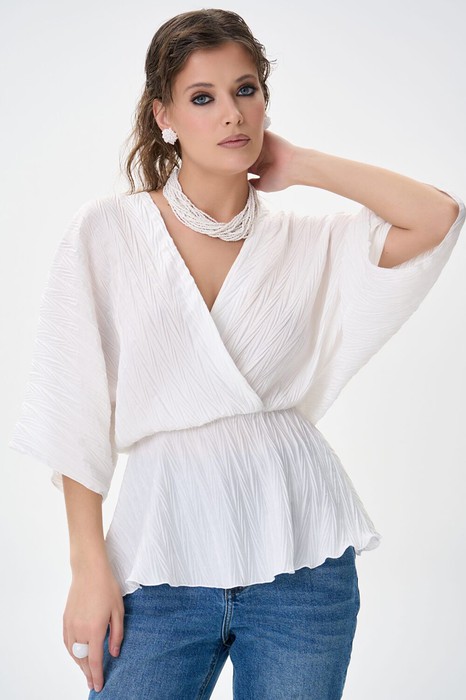 Блузка «Бэт» легко комбинируется с брюками, юбками и жакетами, создавая как офисные, так и повседневные образы. Особая текстура делает вещь интересной сама по себе — вам не нужно ничего дополнительного, чтобы образ выглядел стильно и завершённо.