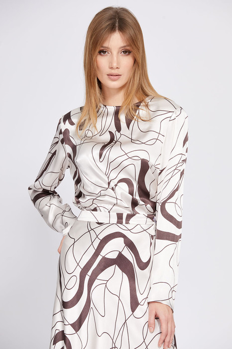 Блузка выполнена из атласа с абстрактным принтом. Застежка на потайную молнию в среднем шве спинки. Горловина округлой формы. Рукав одношовный. Блузка с плечевыми накладками.