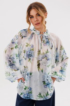 Блузка выполнена из плательно-блузочной ткани с принтом. Блузка прямого покроя, длиной до линии бедер. Спереди застежка с планкой на пуговицы. Спинка цельная. Воротник стояче-отложной. Плечевой шов удлинен. Рукав покроя "кимоно", длиной выше линии локтя.
