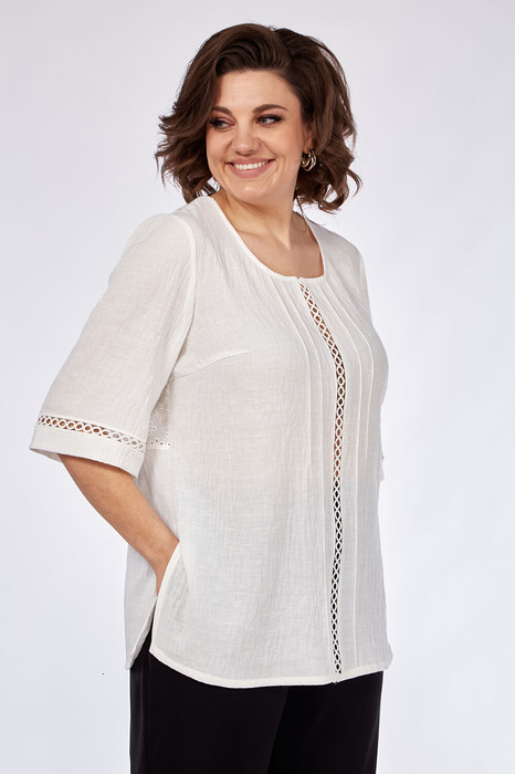 Блуза женская свободного кроя из блузочной ткани, комбинированная хлопковой тканью “ришелье”. Горловина круглой формы. На полочке по центру вставлено кружево, застрочены защипы, нагрудные вытачки. Спинка комбинированная, отрезная по талии со сборкой. Вверху фигурный вырез и завязки. Разрезы в боковых швах. Рукава втачные, свободные с отделкой кружевом.