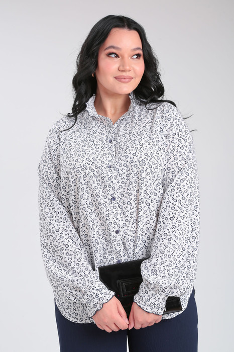 Нарядная романтичная блузка свободного силуэта, выполнена из легкой стрейчевой ткани, с втачным рукавом. Воротник стойка и манжет с рюшей, застежка на петли пуговицы. Блузка будет прекрасно смотреться в комплекте с брюками, а так же с юбкой, каждый раз помогая Вам создавать новый неповторимый образ. Приятная ткань, современный стиль, интересный дизайн, свободный покрой, широкий размерный ряд.