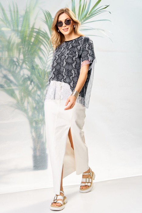 Джемпер  двухслойный,  свободного силуэта, с втачными рукавами.Нижний из хлопкового трикотажа,верхний-из сетки средней жесткости с легкой эластичностью с дизайнерским принтом. На нижней детали переда джемпера по центру нанесена декоративная печать, вырез горловины округлой формы  с втачной бейкой.Рукава втачные одношовные, короткие.