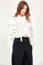 Элегантная дизайнерская блузка со складками выполнена из нежного щелк атласа с матовым блеском и декором из жемчуга отлично впишется  в ваш гардероб, легко сочетать как с брюками так и с юбкой. Блузка  прямого силуэта со средним швом и  V-образным вырезом с мягкими складками по горловине от плечевого шва, средний шов украшен пришитыми жемчужинами.  Спинка цельная, линия низа фигурная. Рукав втачной с притачной манжетой, застегивается на жемчужные пуговицы.