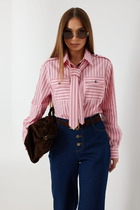 Блуза из тонкой ткани с атласным эффектом, свободного силуэта с V-образным вырезом. Это довольно глубокий вырез, который прекрасно подчёркивает декольте и линию шеи. Застежка на навесные петли и пуговицы. Рукава длинные объёмные втачные заканчиваются широкой манжетой с застёжкой на навесные петли с пуговицами.