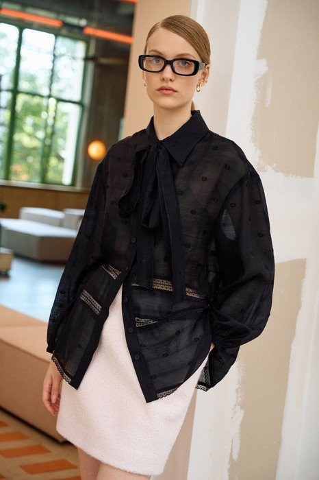 Блуза свободного кроя, прямого силуэта. Линия плеча спущена, по низу рукава приточная манжета на застежку петли и пуговицы. Воротник рубашечного кроя, застежка на петли и пуговицы. По переду и спинке вшито кружево. Ярким дополнительным акцентом является съемный бант, который также можно использовать как пояс.