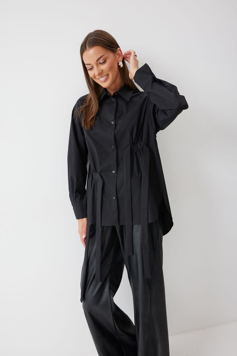 Блузка прямого силуэта из хлопковой ткани с фигурным низом. Воротник рубашечного типа  по центру с застежкой  на кнопки. Рукав со спущенной линией плеча, по низу манжета с застежкой на кнопку. На спинке кокетка и складки. По переду декоративные  элементы со сборкой. Обращаем ваше внимание, что фурнитура может отличаться от фото.