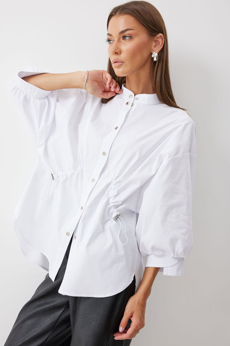 Блузка прямого силуэта из хлопковой ткани с фигурным низом. Воротник –стойка,  по центру застежка  на кнопки. Рукав  спущенный с заниженной проймой, по низу рукава сборка и декоративная манжета. По переду декоративная кулиса с фиксаторами для регулирования степени прилегания изделия. На спинке кокетка и сборка по центру. Обращаем ваше внимание, что фурнитура может отличаться от фото.