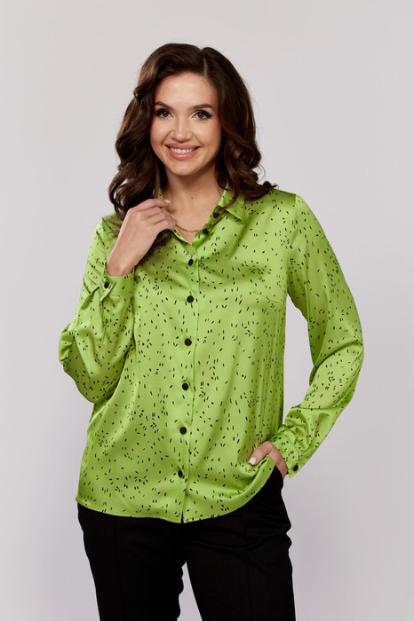 Блузка женская прямого силуэта на центральной застежке на петли и пуговицы. Перед с нагрудными вытачками от боковых швов. Спинка цельнокроеная. Рукав втачной одношовный длинный по низу со сборкой и на манжете, застегивающемся на петлю и пуговицу. Горловина на стойке с воротником.