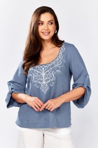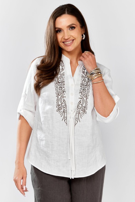 Блуза прямого силуэта.По спинке плечевые вытачки По переду нагрудные вытачки , по центру планка с застёжкой на петли и пуговицы.Вдоль планки одноцветная вышивка. Низ фигурный с разрезами в боковых швах.Воротник-стойка. Плечо слегка спущено. Рукав рубашечного покроя, 3/4 с застёжкой на пату и пуговицу