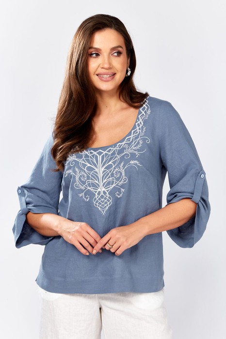 Блуза прямого силуэта. По переду нагрудные вытачки и декоративная вышивка. Горловина округлой формы. В боковых швах разрезы. Рукав втачной, расширен к низу, с застёжкой на пату и пуговицу.