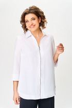 Стильная блуза прямого силуэта свободного кроя. Перед блузки с застежкой на пуговицы, с V-образным вырезом по горловине и нагрудными вытачками. Спинка цельная.  Рукав прямой, втачной, по нижнему срезу сборка. Горловина изделия, низ рукава  окантованы косой бейкой из отделочной ткани, переходящей в завязку на бант. Низ изделия фигурный отстрочен отделочной строчкой с небольшими разрезами по боковым швам.