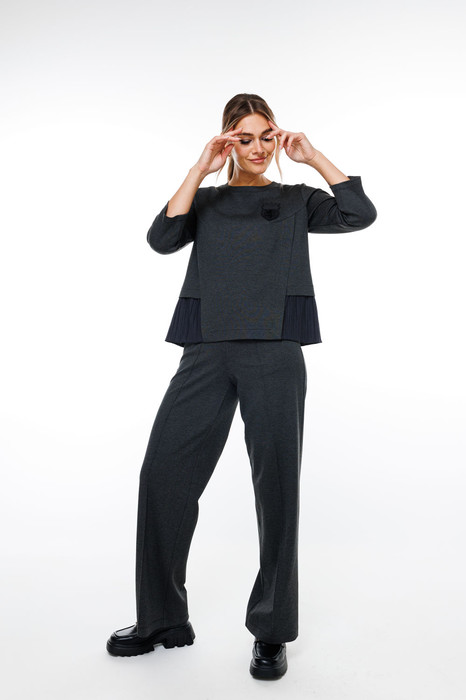 Блуза прямого свободного кроя с округлым вырезом горловины с декоративной нашивкой. По переду две отлетные складки в рельефе. Рукава втачные длиной три четверти. По низу изделия притачной волан из трикотажного гофре.