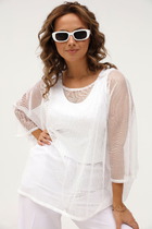 Нежная блуза с асимметричным верхом прямого кроя. На правом плече расположены складки, рукава-фонарики. Один рукав втачной, второй с открытым плечом, собран на резинку. Горловина обработана обтачкой. Низ рукава на резинке.