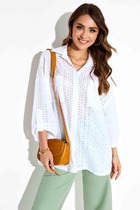 Элегантная блузка прямого силуэта, выполнена из шелковистой эластичной плательной ткани. Перед и спинка блузки целые, по переду две нагрудные вытачки. Круглый вырез горловины переда и горловина спинки обработаны обтачками. По горловине спинки небольшой щелевидный разрез с застежкой на воздушную петлю и пуговицу. Особую элегантность блузке придает втачной длинный рукав с притачным манжетом по низу. Вертикальный разрез по всей длине передней части рукава и сборка по шву притачивания манжеты делают рукав свободным и удобным в носке. Манжеты с застежкой на петли и пуговицы. Длина рукава от плеча в 46 р-ре – 60 см. в 62 р-ре – 63 см., ширина рукава по низу в 46 р-ре 20 см. в 62 р-ре – 24 см. Блузка без подклада. Длина изделия по спинке в 46 р-ре – 63 см. в 62 р-ре – 72 см.